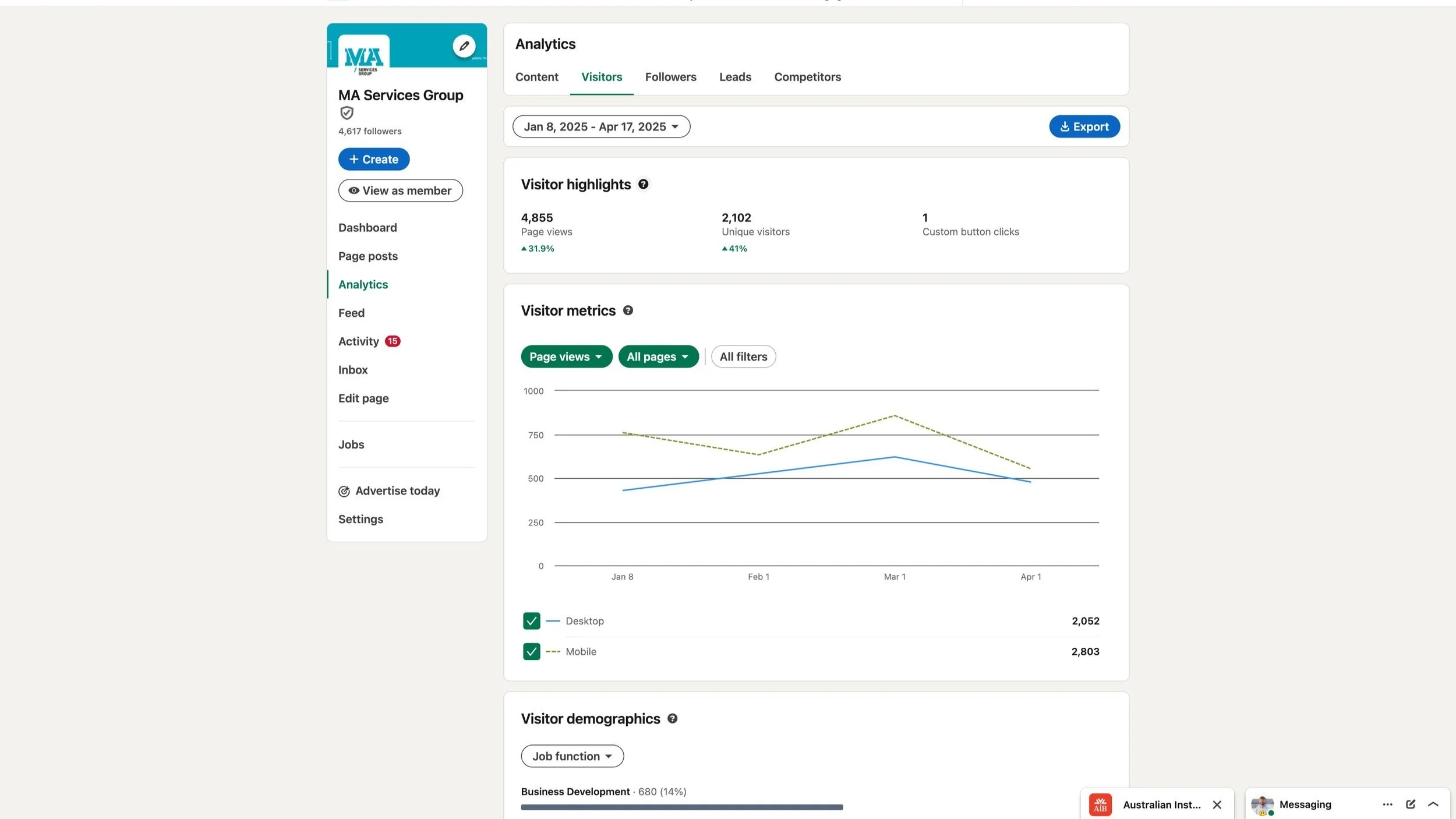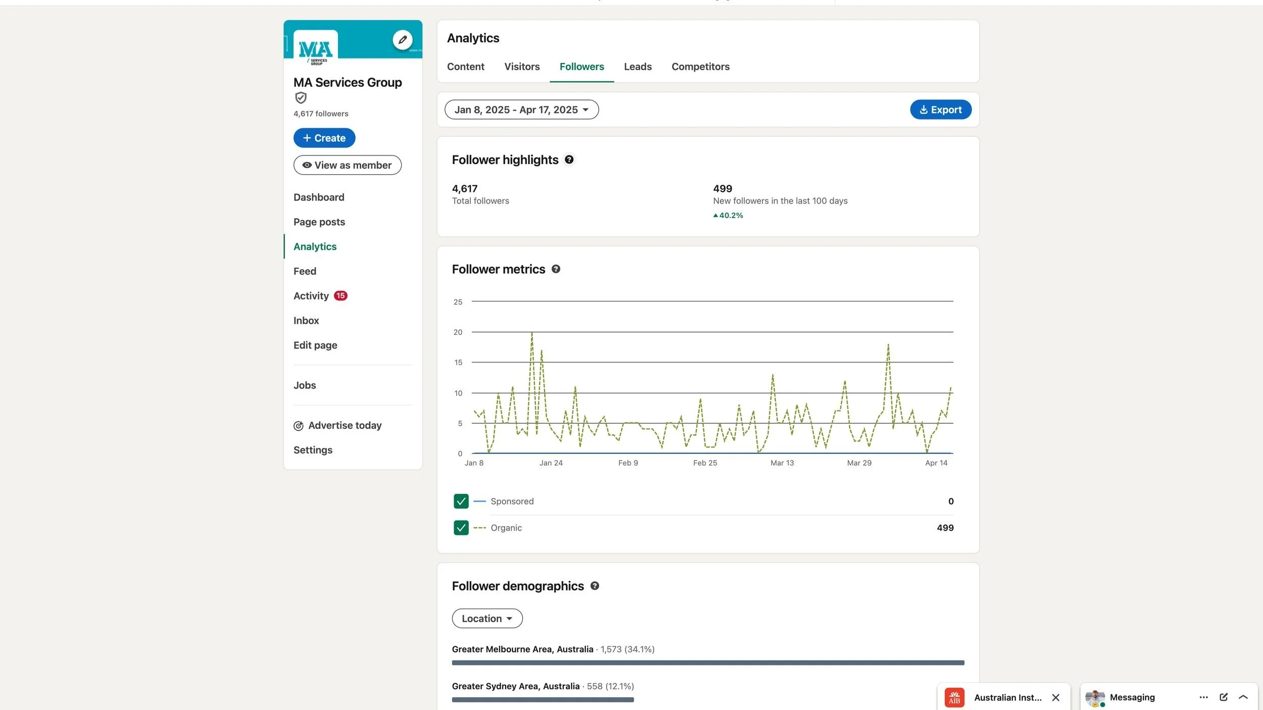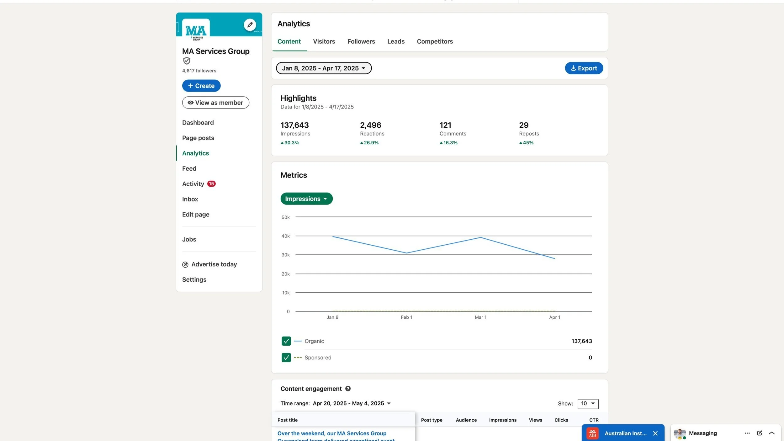 In the first 100 days of managing social media for MA Services Group — a national B2B services company operating across Australia and New Zealand — I led social media management, content strategy, and multimedia production, driving an organic content transformation that delivered real, measurable growth. With no paid advertising, just strategic content and a deep understanding of the audience, I focused on LinkedIn as our primary platform (given the B2B nature of the business) and achieved:
